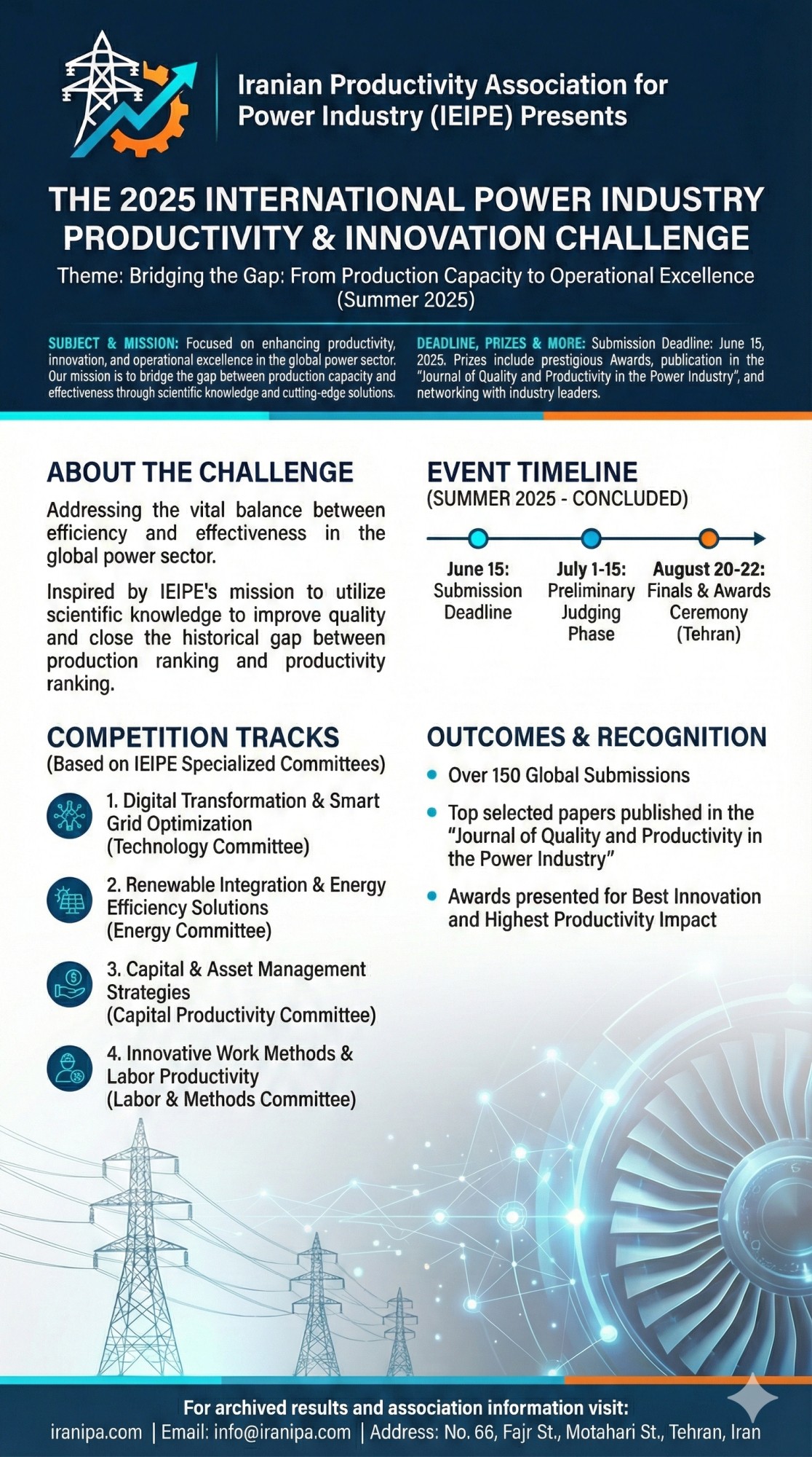 Tehran, August 2025 – The Iranian Productivity Association for Power Industry (IEIPE) is proud to announce the successful conclusion of its flagship event, The 2025 International Power Industry Productivity & Innovation Challenge. Held from August 20th to 22nd, the finals brought together researchers, industry leaders, and innovators to address the vital balance between efficiency and effectiveness in the global power sector.